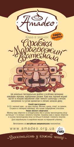 Унікальна гватемальська арабіка з особливо великими зернами, відібраними вручну. Ця кава володіє терпким, міцним настоєм і яскравим вираженим смаком темного шоколаду з легкою кислинкою і густим ароматом з димними відтінками.
