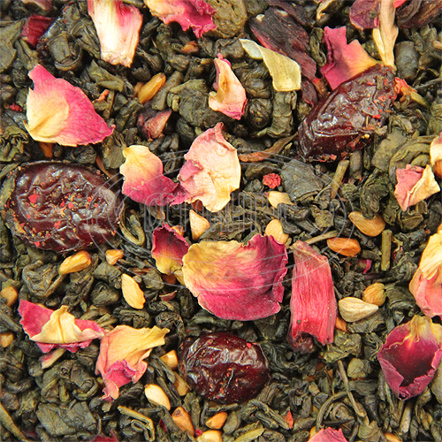 Зелений ароматизований чай на основі "пороху" з пелюстками граната і троянди, журавлиною і шипшиною. Має приємний смак і аромат.