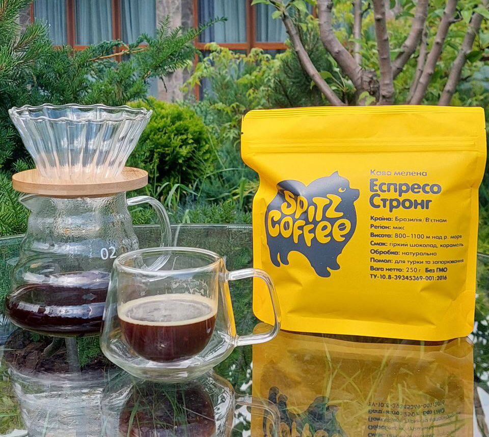 Арабіка Бразилія, робуста В'єтнам, лагідне обсмаження, для приготування в турці, гейзерній кавоварці, в ріжковій та крапельній кавоварках, в чашці. Міцна, з гірчинкою, нотки темного шоколаду, карамелі
