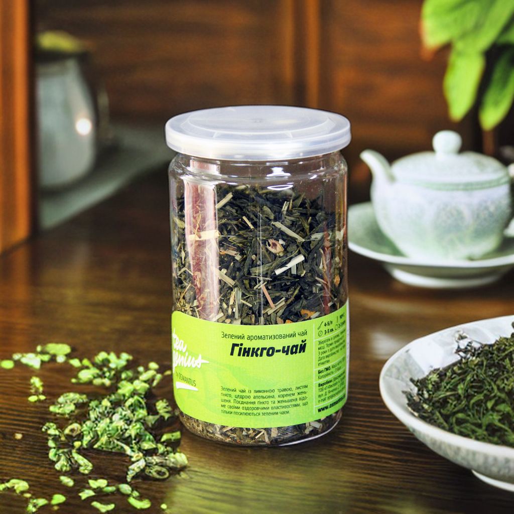 Зелений чай з лимонною травою, листям гінкго, цедрою апельсина і коренем женьшеню. Поєднання гінкго та женьшеню відоме своїми оздоровчими властивостями, які лише посилюються в зеленому чаї.