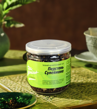 Зелений ароматизований чай "Перстень Сулеймана" з пелюстками соняшника, шматочками ананаса і грейпфрута. Має свіжий аромат грейпфрута.